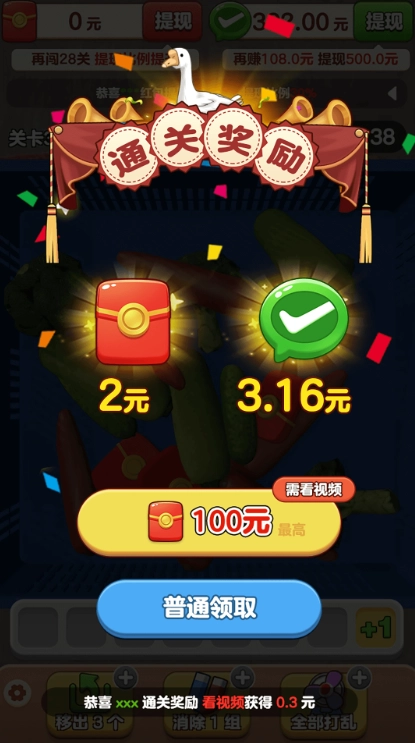 3、只要成功过关,就能收获丰厚的红包奖励。游戏场景实时切换,对于眼力出色的玩家而言,抓住大鹅的几率会更高。