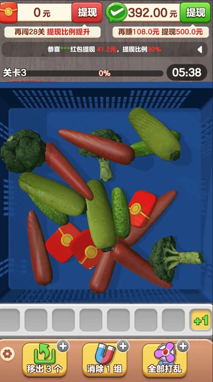 1、关卡中有大量物品,像西瓜、红薯、土豆之类,只需把其中相同的物品收集起来,便可完成任务。