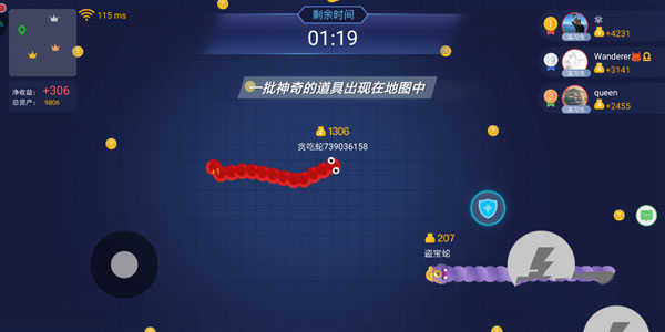 每局比赛共有十位玩家,一局时长三分钟。玩家在收集欢乐币之际,务必留意避免被其他玩家击杀,一旦被击杀,就会失去所有已收集以及自身投注的欢乐币。海盗蛇会携带众多欢乐币,务必记得谨慎将其消灭。游戏过程中还会随机刷新道具,需注意抢先获取。