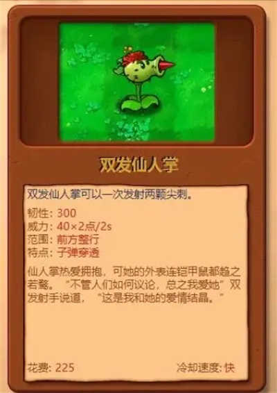 7、双发仙人掌:韧性为300,威力是40x2点/秒,攻击范围为前方整行,特点是子弹具有穿透能力