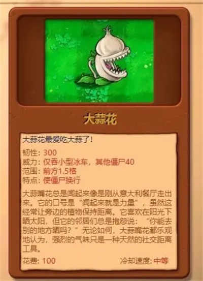 10、大蒜花:韧性为300 ,威力方面,仅能吞食小型冰车,对其他僵尸的伤害是40 。其作用范围是前方1.5格,特点是能让僵尸换行。