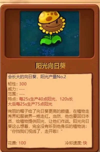 9、阳光向日葵:韧性为300,其特点在于,每25秒能产出40点太阳,120秒之后会长大,长大之后每25秒可产生75点太阳。