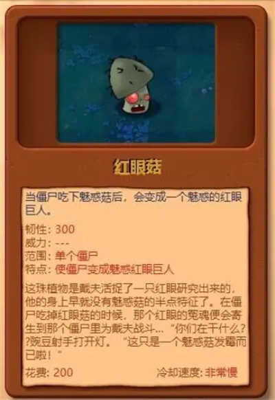 11、红眼蘑:韧性数值为300,作用范围针对单个僵尸,其特点是能将僵尸转变为被魅惑的红眼巨人
