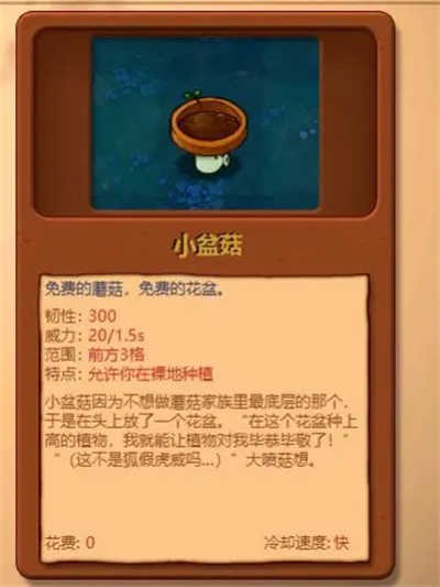 8、小盆菇: 韧性数值为300 ,威力表现是每1.5秒输出20 ,攻击范围是前方3格,具备允许在裸地种植的特点 。