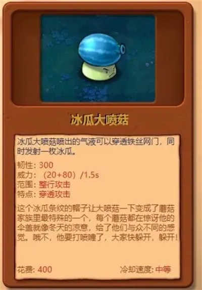 12、冰瓜攻击喷菇:韧性数值为300 ,威力是(20 + 80)÷1.5秒 ,攻击范围为整行,具备穿透攻击的特点。