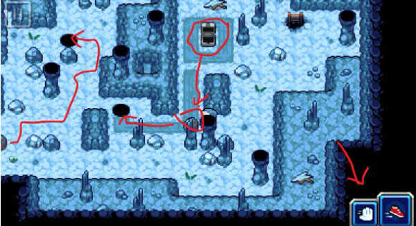 依旧是第三层,最下方的那个冰场起初无法通行,需走右边的梯子,上去后能看到一个箱子,把技能切换为“推”,按照图示将石头推下去,才能通过第三层的那个冰场。