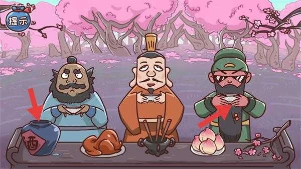 2、踏入桃园场景,可见桌上摆放着酒坛、烧鸡、桃子等物品。依照提示为人物斟酒,促使他们筹备结义仪式,从而推动游戏进程。