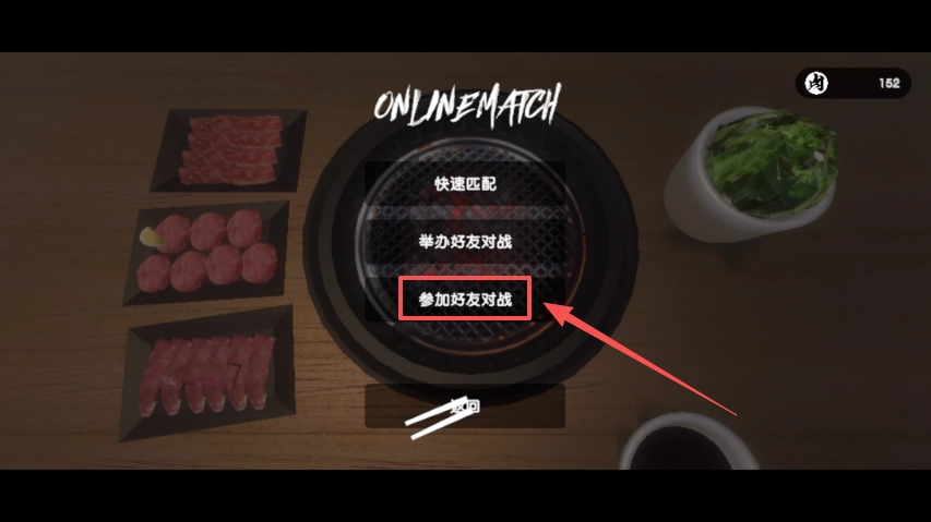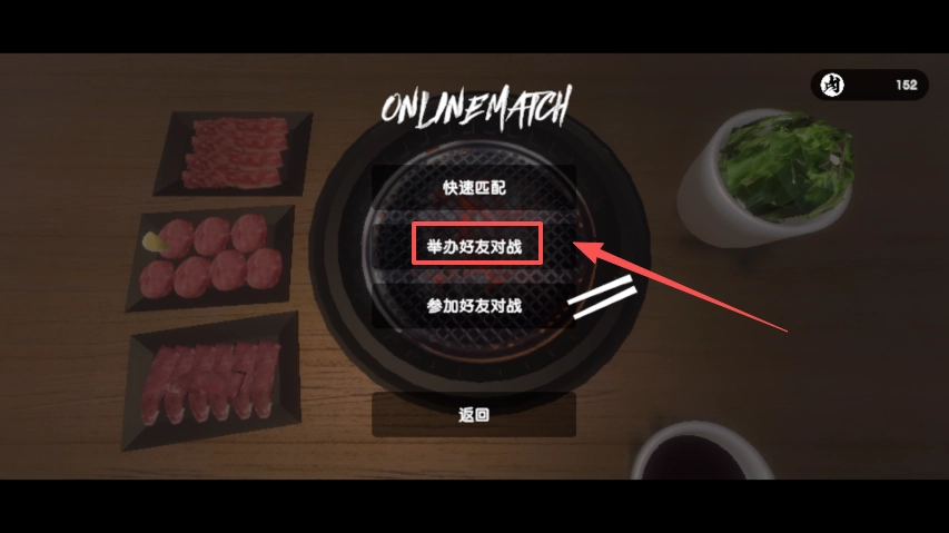当烤制结束后,玩家只需将烤好的肉拖入调料碗,系统便会依据烤肉的成熟度给出相应评分。不仅如此,玩家还能够自由布置烤肉环境,打造独具个性的烤肉店铺。游戏还支持联机对战以及好友合作经营模式,大大增添了游戏的趣味性。1. 第一步,点击在线对战。