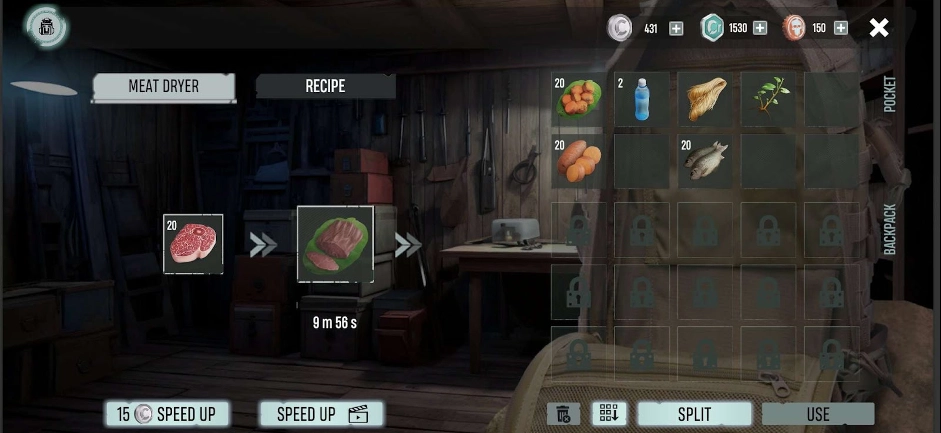 获取肉的途径,一是狩猎鳄鱼或者河马,二是从战利品里找寻。与鱼相同,肉必须在木桩上进行烹制(无论是普通方式,还是在桶中) 。