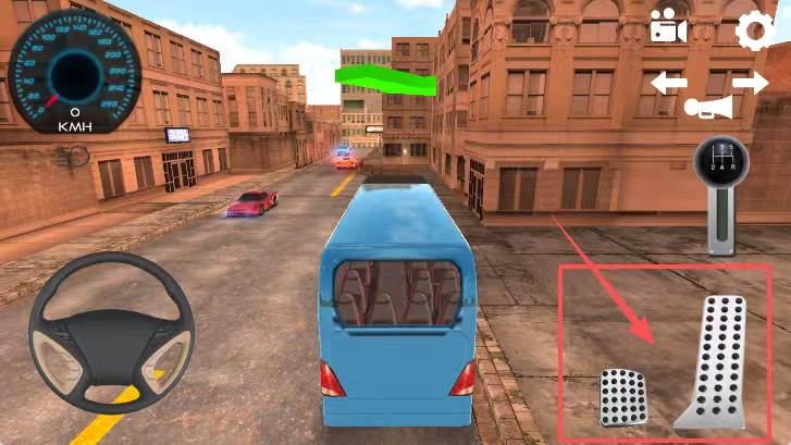 3、从开车视角看,道路上有一辆蓝色大巴,大巴右侧有两个踏板,左前方有一辆红色轿车,左上角是速度表,操控方向盘来控制方向,就能开动这辆巴士。