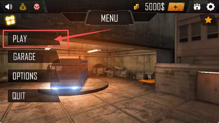 1在灰暗车库的背景下,蓝红巴士停于圆形平台之上。页面上方菜单栏设有PLAY等选项,其中红色箭头正指向PLAY按钮,只需点击此按钮,即可开启游戏。