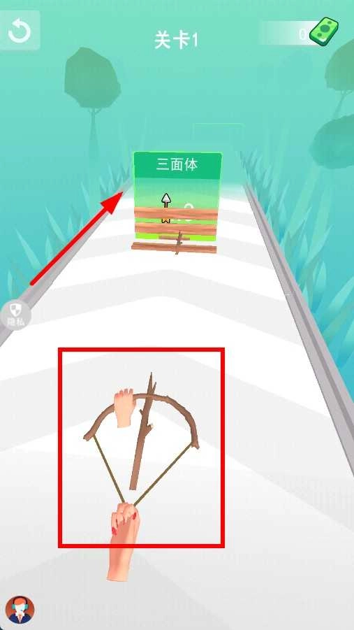 2、踏入关卡后,手持以树枝制成的弓箭,顺着道路前行,将目光锁定在前方标有“三面体”等字样的目标上,做好发射箭矢的准备。