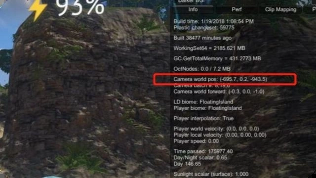 现在可以查看当前所在位置的坐标信息,然后朝着大概(-695.7,0.2,-943.5)这个坐标的方向调整行进的路线,这样就能到达绿岛的登陆入口了。