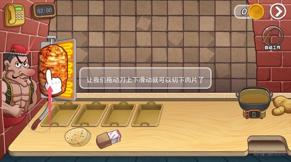 用刮刀在肉的表面来回刮动,就能把烤肉处理好;点击店员,就能让他们帮忙备好酱料和黄瓜。