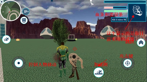 成功落地后,我们可以用左侧的方向键操控角色移动,右侧则依次排列着加速跑、攻击、跳跃按键,同时还能看到血条与能量条的状态显示。