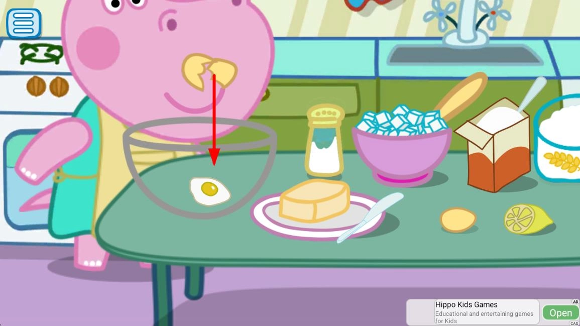 卡通教育画风:选用Q萌的河马形象,搭配鲜亮明快的色彩,食材和厨具的造型设计得夸张又可爱,这样既能降低儿童的操作难度,还能让他们更有代入感。