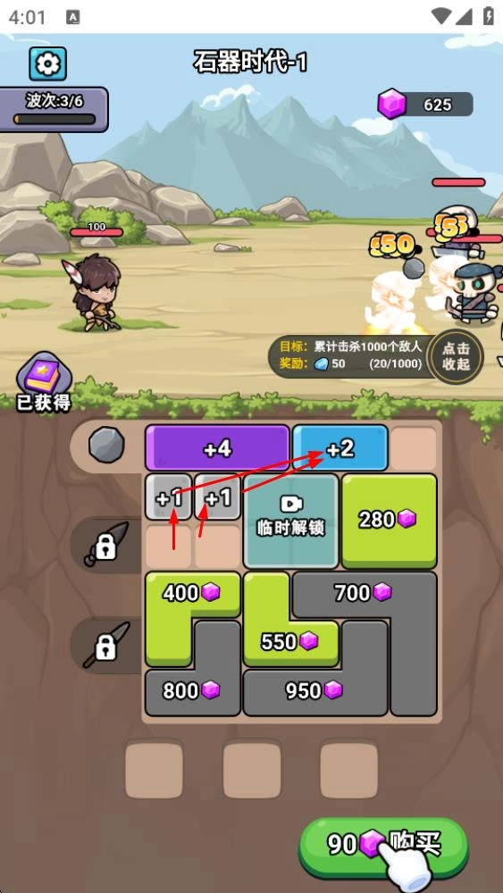 进入石器时代-1这类关卡,需要应对多波敌人,通过积累击杀数量来推进波次的进程。