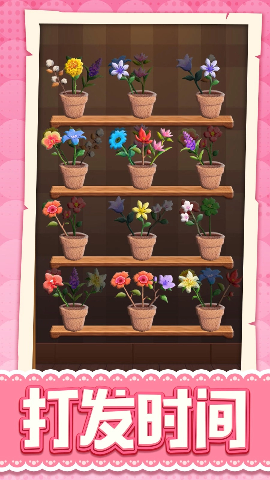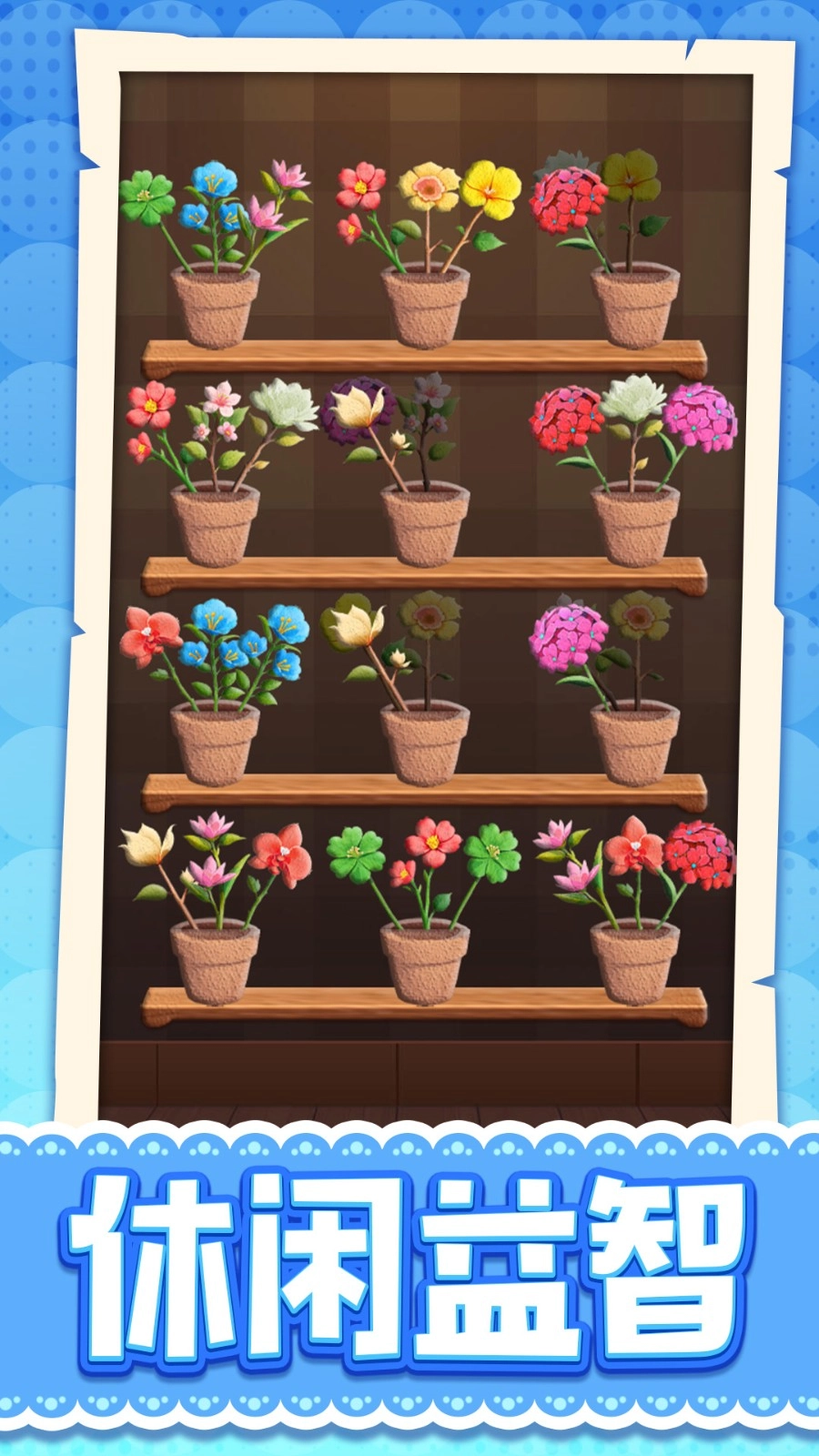 从初始关卡起,把品种相同的花朵归置到同一个花盆里,以此完成消除操作。