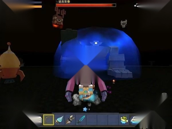 此时的远古巨人为它的第一形态,除了套着一层无敌护盾的远古巨人本体外,它身边还会跟着红、蓝、白三种不同颜色并漂浮在空中的小怪。