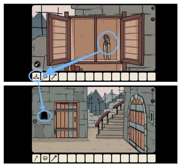 返回地道入口处,按照特定符号的提示解锁右侧的储物柜,从中取出工具「断线钳」。随后将其与衣架拼接成「钩子」,用这个组合工具打开右侧的第一道门(操作示意图见上方)。