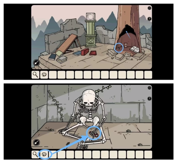 先别急着进去,再往右走到山顶拿到「放大镜」,然后查看书籍里的提示纸,之后进入房间观察地上最后一张提示纸,打开右侧的机关就能得到「鸡腿」了。