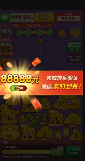 《淘金物语》是一款玩法轻松解压的2048合成类游戏。游戏规则很简单:只需让相同的物品相互碰撞,就能自动完成合成。通过合成,你不仅能解锁全新的物品,还会触发对应的福利奖励——这些福利可以直接领取,更能帮你开启智能掉落功能,让后续的物品合成过程变得更加高效快捷。