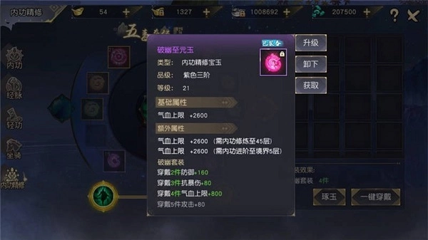 宝玉升级离不开玉髓,日常活动和琢玉操作都是获取玉髓的途径。宝玉等级越高,带来的属性提升就越明显。不过想提醒萌新少侠们:尽管生命加成对战斗力的提升幅度不小,但内功精修时,更建议优先给攻击、爆伤类型的宝玉升级——哪怕这样加的战力可能少一些,实际输出能力却会有显著提升。