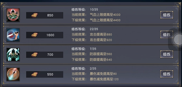 演武堂当前提供4种不同的修炼方向,这些修炼之间互不冲突,玩家可同时选择;