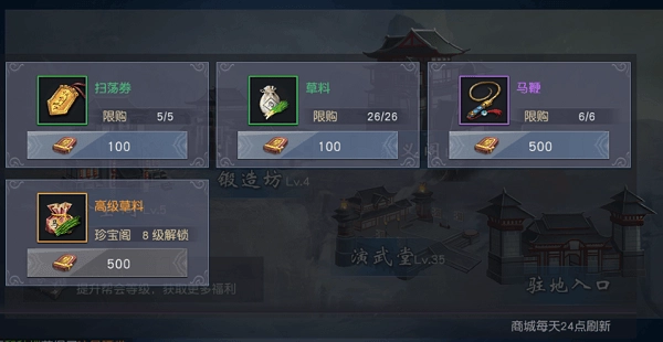 聚义阁每提升1级,珍宝阁可随之升级1级,演武堂可随之升级5级,锻造坊可随之升级1级。