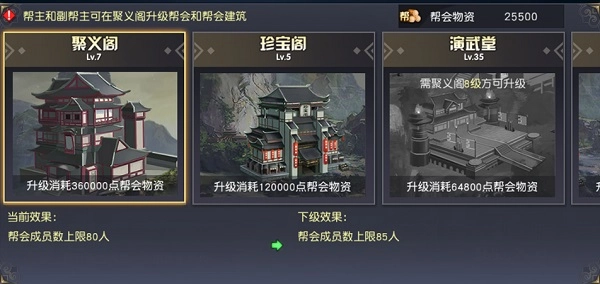 聚义阁升级后,能够提升帮会的成员容纳上限以及其他建筑的等级上限;