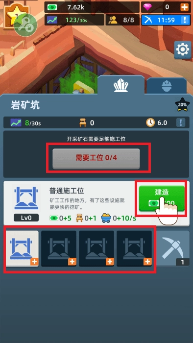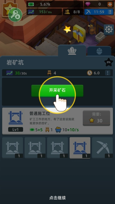雇佣更多工人来增加收入、实现致富目标,同时提升矿山的知名度。务必记得升级工作站,以此加快挖掘效率。
