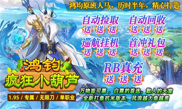 鸿钧疯狂小葫芦是一款玩法别具一格的玛法传奇游戏,引领玩家踏入热血沸腾的冒险天地。在这款游戏里,玩家能够提升角色等级,解锁强悍的战斗能力,感受如梦似幻的征途,成长为英勇无畏的冒险者。