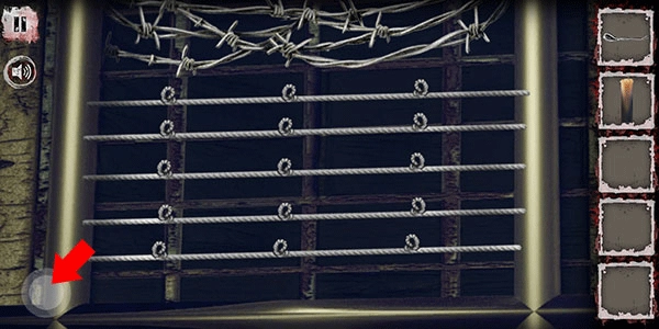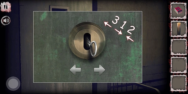 之后再次回到室内,接下来我们点击左侧的铁门,并用刚才拿到的钢丝来开锁。开锁时按照之前看到的小人操作方向,即“左右左”的顺序,对应次数分别为3次、1次、2次,就能撬开门锁了。