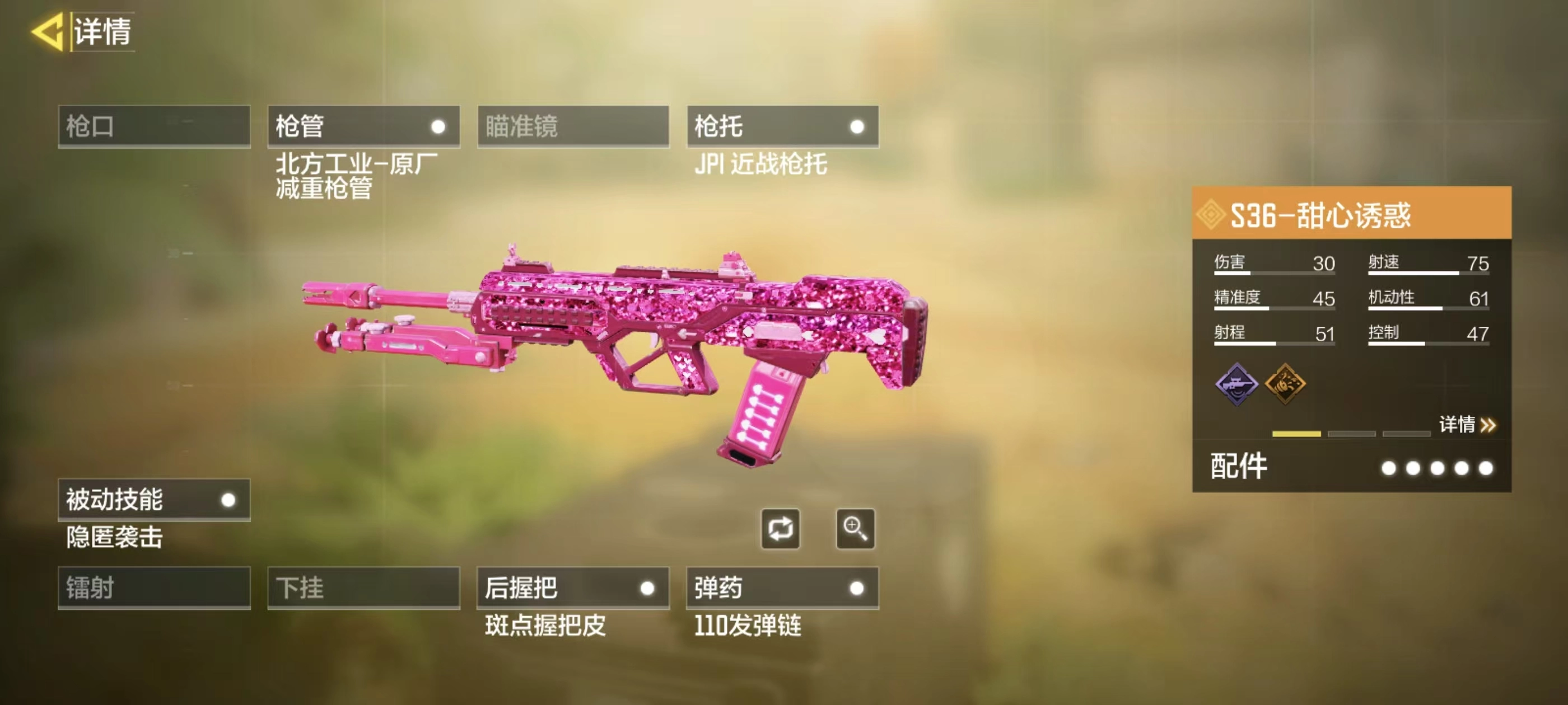 推荐搭配的枪械增益为:不动如山、扩容、飞毛腿、闪光手电筒