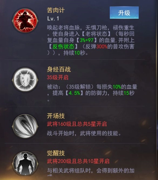 开局自带苦肉计技能,相当于给黄盖加了层三倍反弹的反甲——你打我越狠,我越兴奋,尽管放马过来!35级解锁被动后,每损失10%血量就提升4.5%防御,这坦度简直无解~