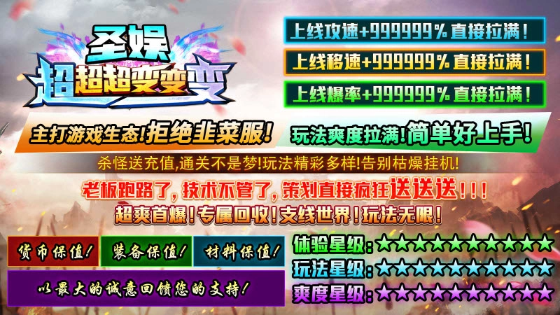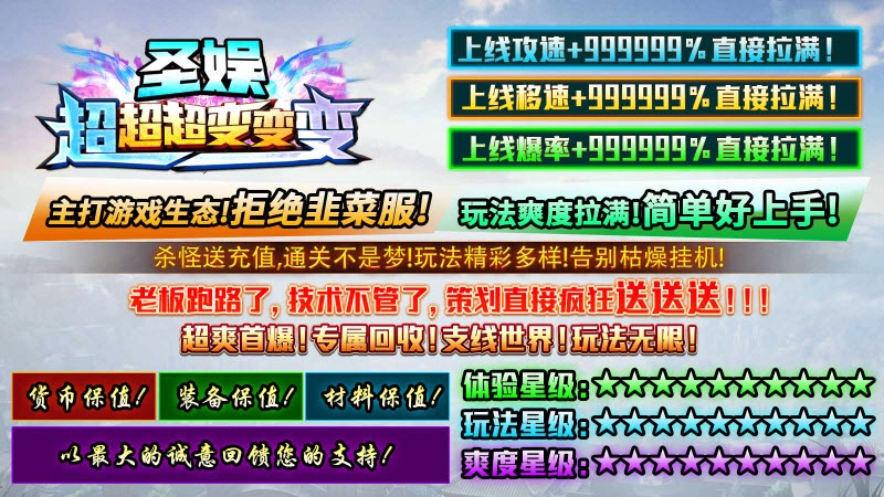圣娱超超超变变变,全新超变版本的传奇游戏来啦!游戏一上线就送超变态属性,打怪体验简直爽翻天!刀刀都是暴击,刀刀附带切割,刀刀还能触发光柱特效。同时,游戏也给玩家准备了超多福利,像免费的自动回收、自动捡物功能全都有,装备掉落也有保障,怪物和BOSS还能爆出各类材料,哪怕不氪金,只要肯花时间就能慢慢变强!