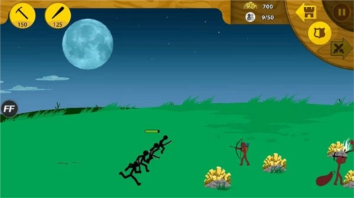 只要矿石数量充足,就可以点击攻击型火柴人,让它们去摧毁敌人的基地。