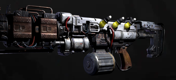这是一款军用标准级别的机枪,其枪身内部采用电磁导轨技术来提升子弹射速,能够瞬间穿透厚重的金属护甲。不过,由于它拥有极高的枪口动能和过于沉重的体积,对使用者的力量提出了极高的要求。也正因为这个原因,使用该武器的人员,其手臂明显比常人粗壮数倍。