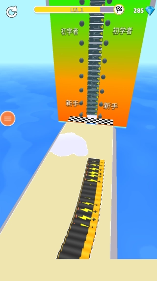 能量积累机制:在跑道上收集相同颜色的电池,能够让角色的移动速度加快、护盾持续时间延长,不过需要在冒险去拾取远处道具和确保稳定通关之间权衡风险与收益。
