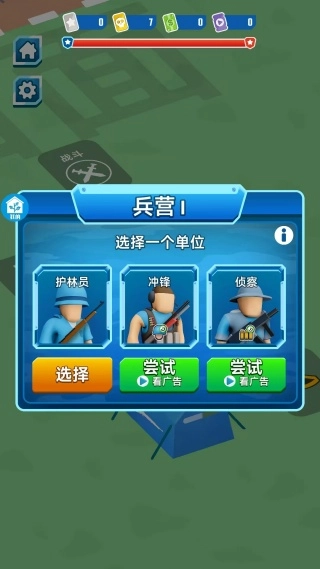 进入游戏后,第一步得创建兵营,接着从护林员、冲锋、侦察这类单位里选一个。