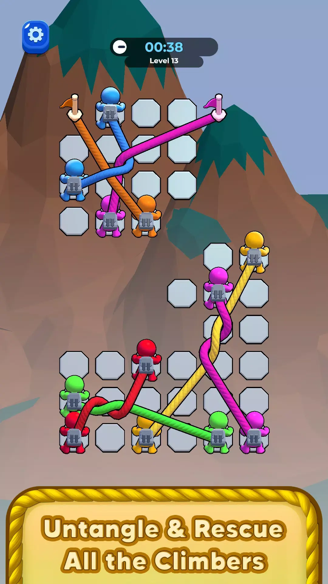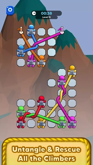 纠结爬山游戏是一款结合了登山冒险与益智解谜元素的紧张刺激游戏,其核心玩法聚焦于解绳机制。玩家将化身经验丰富的登山者,在布满复杂绳索系统的陡峭山壁前,凭借逻辑推理能力与空间思维,解开那些相互缠绕、打结或固定的各类绳索,从而为登山者开拓出一条通往峰顶的安全路线。