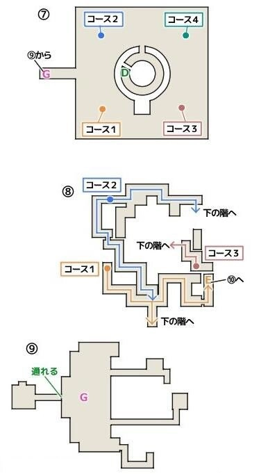 图中左上、左下、右上、右下四个方位各有一个可前往的地点,站在特定石板上即可启动机关前进。需要注意的是,只有图中左侧的两个入口是正确路径,其中左下入口最为简单——启动机关后会直接降至8号阶层,只需沿着コース1(或コース2)的路线方向依次触发机关即可。但要提醒的是,一旦选错入口便无法回头,最终会被引导至9号标记的大房间,必须击败42级的火巨人才能脱出并返回7号区域重新开始。