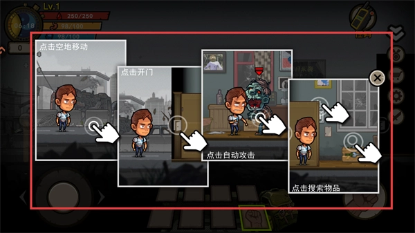 按照指引熟悉基础操作步骤:先点击空地完成移动,接着执行开门动作;战斗环节启用自动攻击功能;通过搜索物品来获取所需资源。