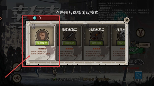 选择简单模式开启游戏,此模式下丧尸每7天会强化一次,前7天内若死亡可复活,很适合新手玩家。