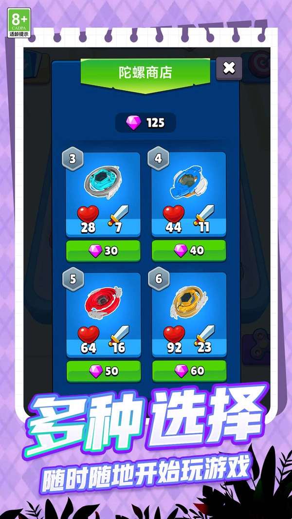 多种可收集陀螺系列,包含复古木质、未来机甲等主题,稀有陀螺附带特殊光效轨迹。