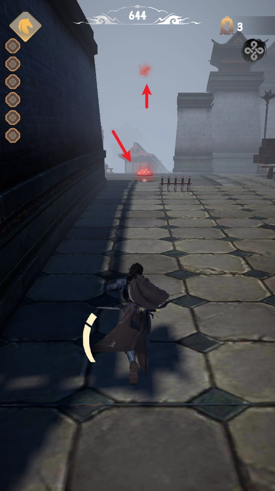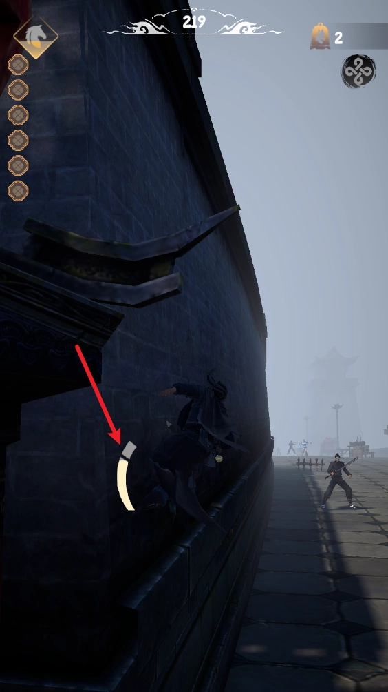 跳跃后朝着墙壁的方向滑动屏幕就能实现飞檐走壁,不过这一操作会消耗能量条。