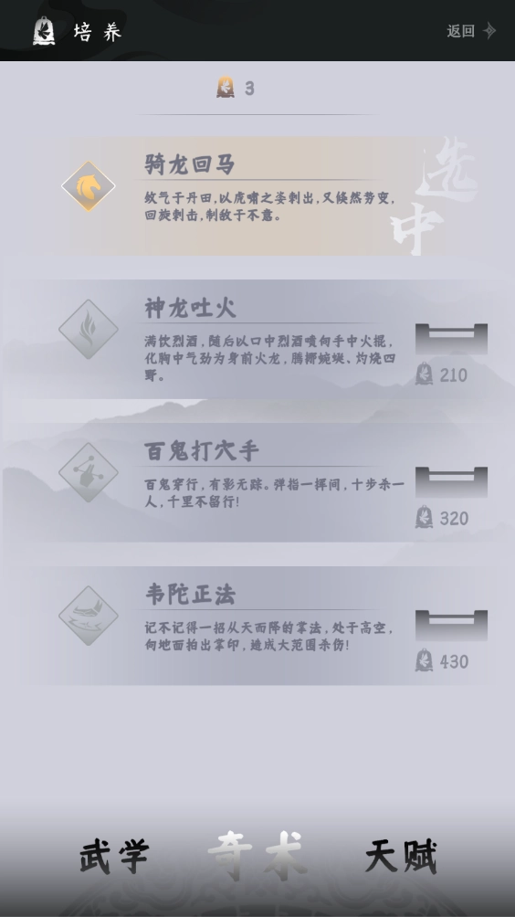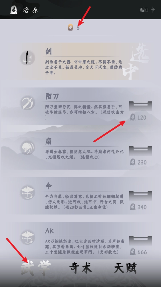 进入之后,在武学界面可以解锁各类武器,不过解锁需要消耗道具,而这些道具得通过关卡来获取。