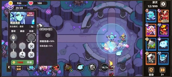 屏幕右侧的UI区域展示着你所携带的角色,其上方显示当前波次与最大波次,下方设有自动和倍速功能按钮;而每个角色左上角的标识,代表着该角色的定位,也可理解为其功能属性。