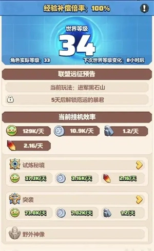 还可以加入联盟,结交许多好友,也能完成职业转职,使当前世界等级提升至34级,让突袭关卡推进到20关。另外,还能探索完地图进度,完成对世界首领的攻打。