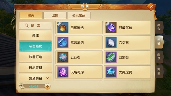 寄售里的商品全是玩家上架的,交易时只能使用军资。这正是军资在这款游戏里如此重要的缘由。